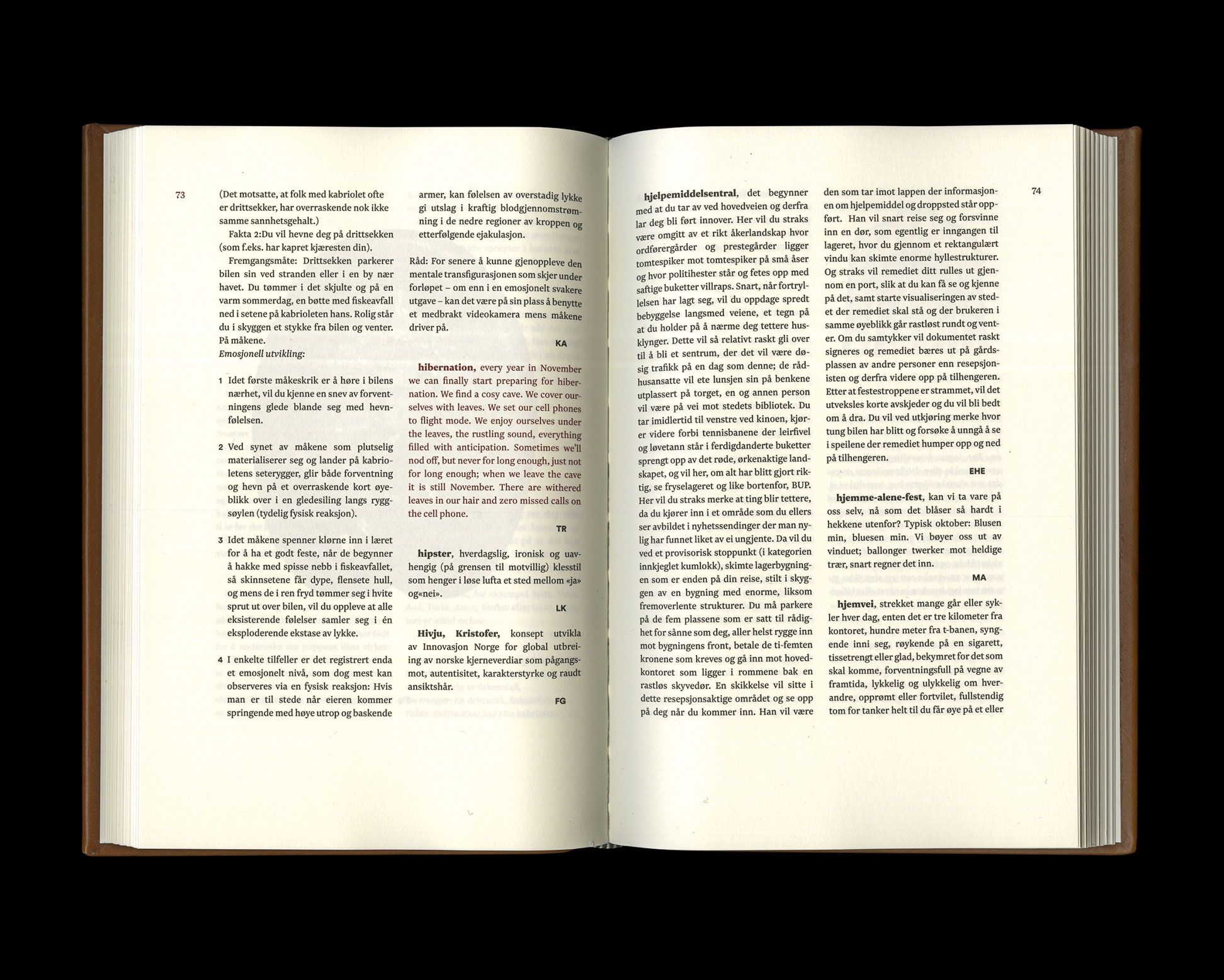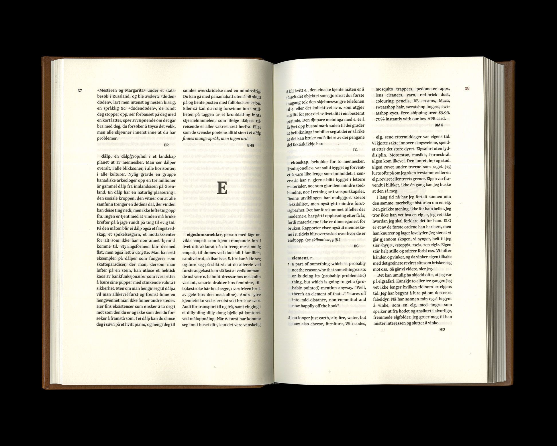 Cappelens Forslags Conversational Lexicon, Volume II was first published in Norway in November 2016 in an edition of 1100 numbered copies, each hand bound in calfskin leather by a third generation bookbinder and with a separate run of 5 numbered copies bound in Icelandic wolf-fish. The book is printed on 150gr. Scandia paper. It was financed by by a crowdfunding campaign that ran in May and June of 2016, which yielded a production budget of €46270, or $48163. The volume follows up on Cappelens Forslags konversasjonsleksikon, a book conceived as a defense of the paper book format as well as a life raft for the independent bookstoreCappelens Forslag. For the full story of the genesis of the series, read on here.